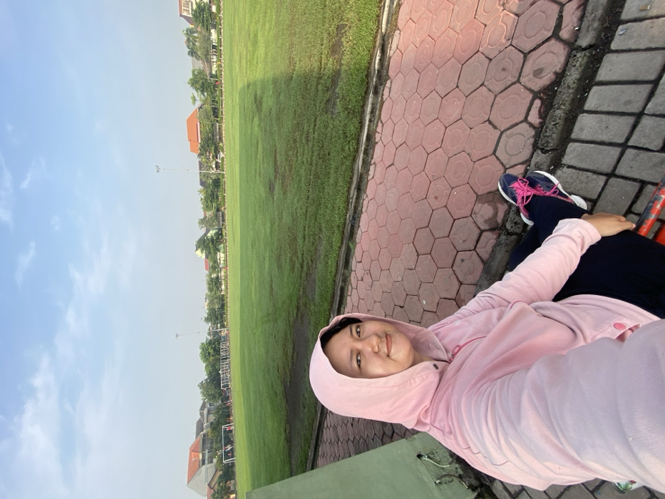 A woman in a pink hoodie sits near a green field under a partly cloudy sky. She's on a hexagonal-patterned path next to a curb, wearing sneakers with pink laces. Buildings and trees are visible in the background near the field. The photo's perspective is from slightly above, capturing the woman's upper body and legs. The lighting suggests it's daytime.