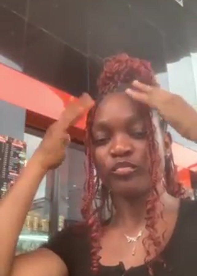 A young woman stands in front of a building with a red and black exterior, possibly a restaurant or store. She has brown skin and her hair is styled in a high bun with red-brown braids and curly strands framing her face. She wears a black shirt and a silver necklace. Throughout the video, she gestures with her hands, alternating between raising her right hand, resting her chin on her fist, and making other hand movements as she speaks. The building behind her has a window displaying a menu and some beverages inside.