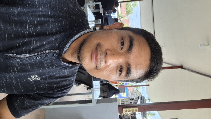 A medium shot captures a man indoors. He wears a dark, patterned shirt with a buttoned collar. His face is well-lit, showing a slight smile. In the background, other people are seated at tables, suggesting a cafe or restaurant setting. Outside, a blue sign is visible. An electrical outlet is visible on the lower right, along with structural support for the ceiling. A light fixture hangs from the ceiling.