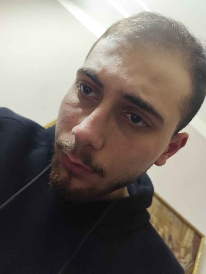 A close-up, tilted selfie of a young man with dark hair and eyes. He has a short beard and mustache with some redness on his face. He is wearing a dark hoodie. The background is a light, neutral wall. A framed picture is partially visible in the lower right corner. The lighting is soft and diffused, creating a casual and unfiltered appearance. The man's expression is thoughtful and introspective.