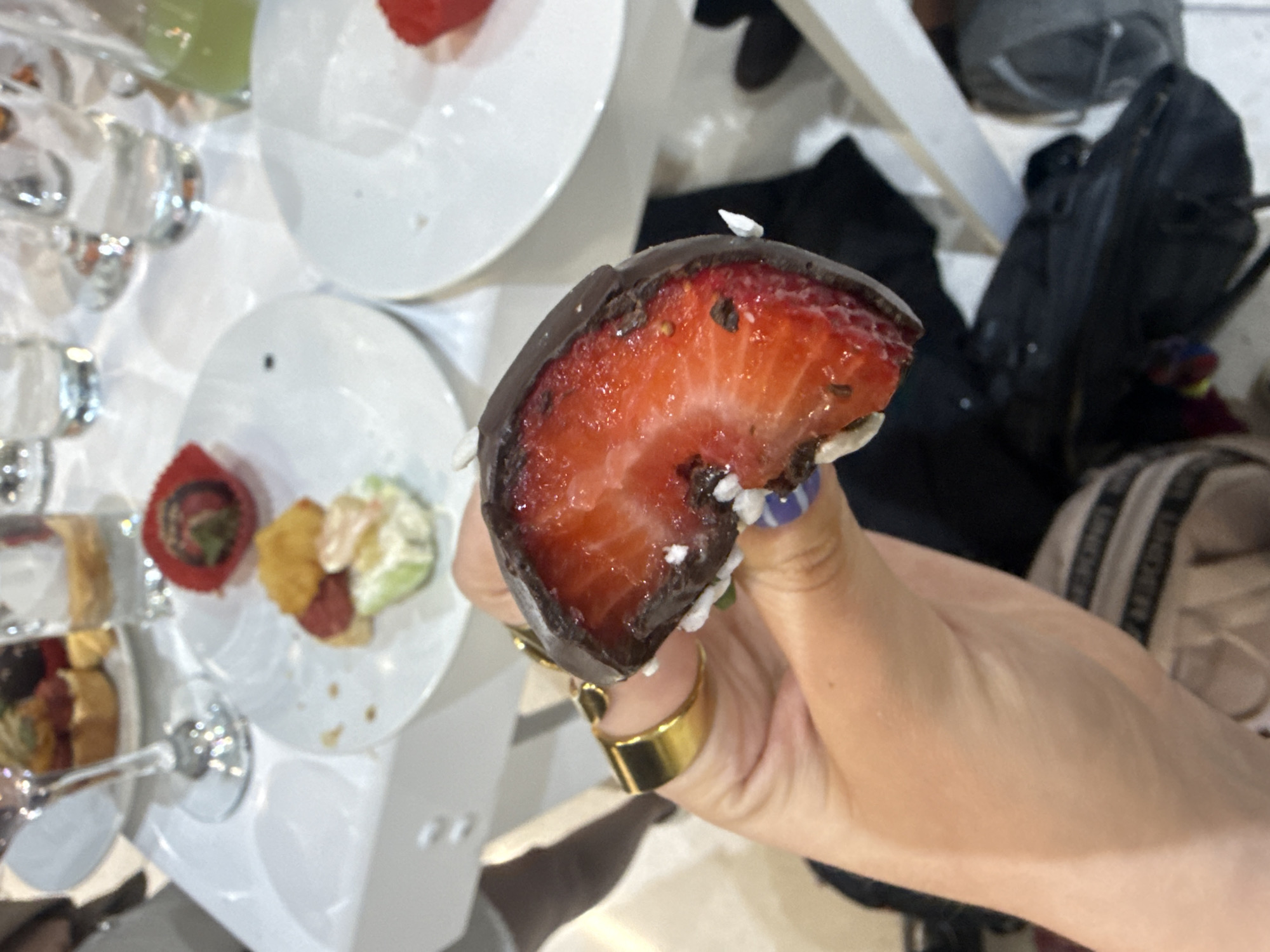 The image displays a close-up, high-angle view of a partially consumed chocolate-covered strawberry held by a human hand, set against a background of a dining table with appetizers. The specific location within Ciudad López Mateos, Mexico, is not discernible from the visual evidence. In the foreground, a light-skinned hand holds a dark chocolate-coated strawberry, which has been cut or bitten in half, exposing its red, fleshy interior with visible seeds. White sprinkles adhere to the chocolate coating. The hand has manicured fingernails, with the index finger displaying blue and white stripes. Two gold-toned rings are present on the ring finger. In the blurred background, a white table is visible, laden with multiple small white plates. These plates contain various small appetizers, including what appear to be mini tarts with colorful toppings (yellow, red, green/white), and another red item presented in a red paper cup. Several clear drinking glasses, some partially filled with liquid, and the stem of a wine glass are also on the table. Portions of a person's legs and feet, wearing light-colored clothing, are visible in the upper left background, suggesting at least one other individual is present at the table. Dark fabric and a bag are partially visible below the table level in the lower right background.