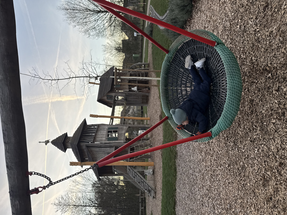 The image depicts a static playground scene in Olingen, Luxembourg, under a pale sky with visible contrails. A young individual, clad in a dark blue padded jacket, a light blue knit beanie, and orange-fingered gloves, lies prone within a circular basket-style swing. The swing features a dark woven base with a thick green rope rim, suspended by four red poles and chains from a heavy wooden beam overhead. The ground beneath the swing and surrounding play area is covered in light-colored wood chips. In the background, two multi-level wooden play structures are visible. The primary structure, left of center, is a tower with a peaked roof topped by a bird-shaped weather vane, an visible window with dark shutters, and an attached wooden staircase and slide. A second, smaller wooden structure stands to its right. The environment includes patches of green grass, several bare deciduous trees, and a winding light-colored path in the distance. The lighting is soft and diffuse.