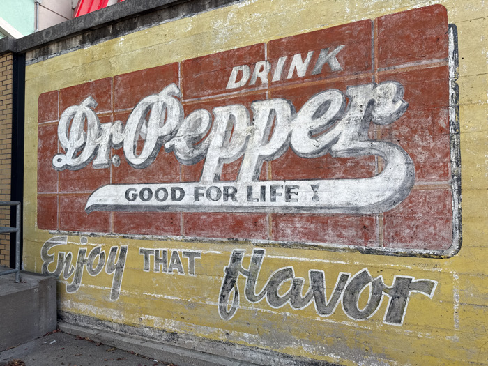 A weathered Dr. Pepper advertisement is painted on a brick wall. The top section, brick red, features "DRINK Dr. Pepper GOOD FOR LIFE!". The text is stylized in white with black outlines. Below, on a yellow background, "Enjoy THAT flavor" is painted in a similar style. The paint is faded, and the wall shows signs of age and wear, adding to the vintage look of the advertisement.
