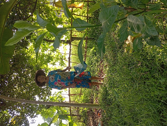 An elderly woman stands in a lush, verdant garden or agricultural plot in Waung, Indonesia
