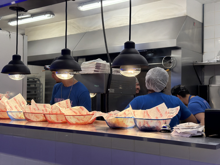 Inside a Franky's Grill kitchen, three black pendant lights illuminate the counter. Workers in blue shirts are seen, one wearing a hairnet and another a cap. Baskets lined with "Franky's Grill" printed paper are ready for food orders. Stainless steel equipment and a large hood vent are in the background. Fluorescent lights on the ceiling add to the brightness of the scene.
