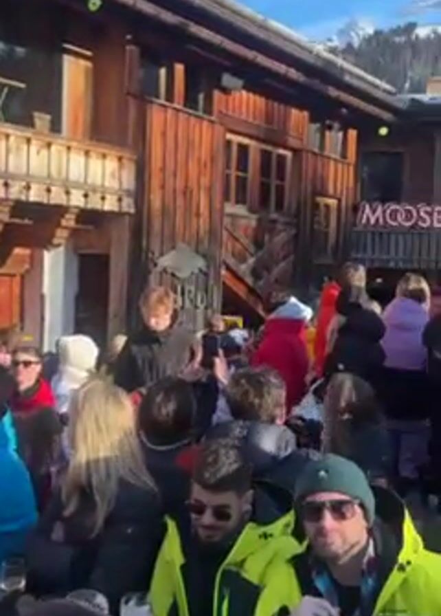 crowded outdoor gathering at a place called "Mooserwirt". There are many people dressed in winter clothing, some wearing ski gear. They are standing and sitting at tables, seemingly socializing and drinking. The area is outdoors, with wooden buildings and a snowy mountain visible in the background. The weather appears sunny, with the sun occasionally causing lens flare. There are also flags with the name "MOOSERWIRT" on them.