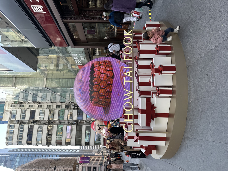 An outdoor display featuring a stack of gift boxes with red ribbons, adjacent to a large, illuminated sphere displaying a hexagonal pattern. The words "CHOW TAI FOOK" are vertically aligned alongside the gifts. A small child sits atop the display, and pedestrians stroll by. Tall buildings line the street, including a structure with numerous windows and air conditioning units. The scene is bathed in daylight.