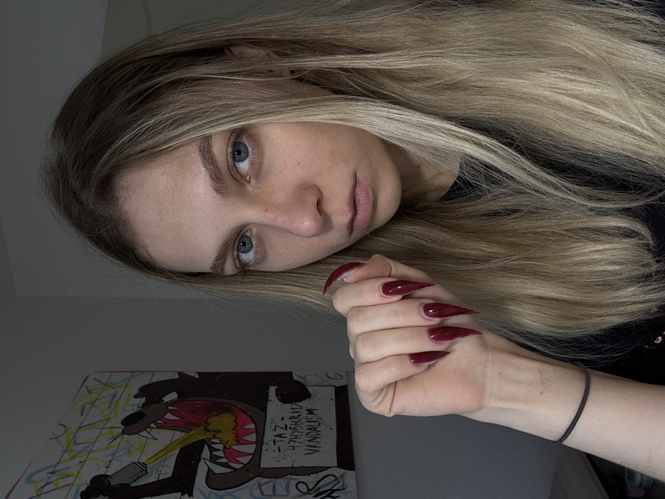 A young adult female, approximately 20-30 years old, with long blonde hair and blue eyes, is depicted from the chest up in an indoor setting. She wears a dark-colored shirt and looks directly at the viewer with a neutral expression. Her left hand is raised to chest height, displaying five fingers adorned with extremely long, dark red, stiletto-shaped artificial nails. A thin black cord wristband is present on her left wrist. In the background, to the left of the subject, a framed artwork hangs on a plain, light-colored wall. The artwork features a stylized cartoon character resembling the Tasmanian Devil, holding a yellow spray can from which yellow spray is emanating. Below the character, white signs with black text are visible, reading "— TAZ — / 47HYGHR11 / VANDALISM". The artwork's background contains multiple colored scribbles resembling graffiti. The specific city location of Zgrade, Montenegro, cannot be determined from the visual information provided within this image.
