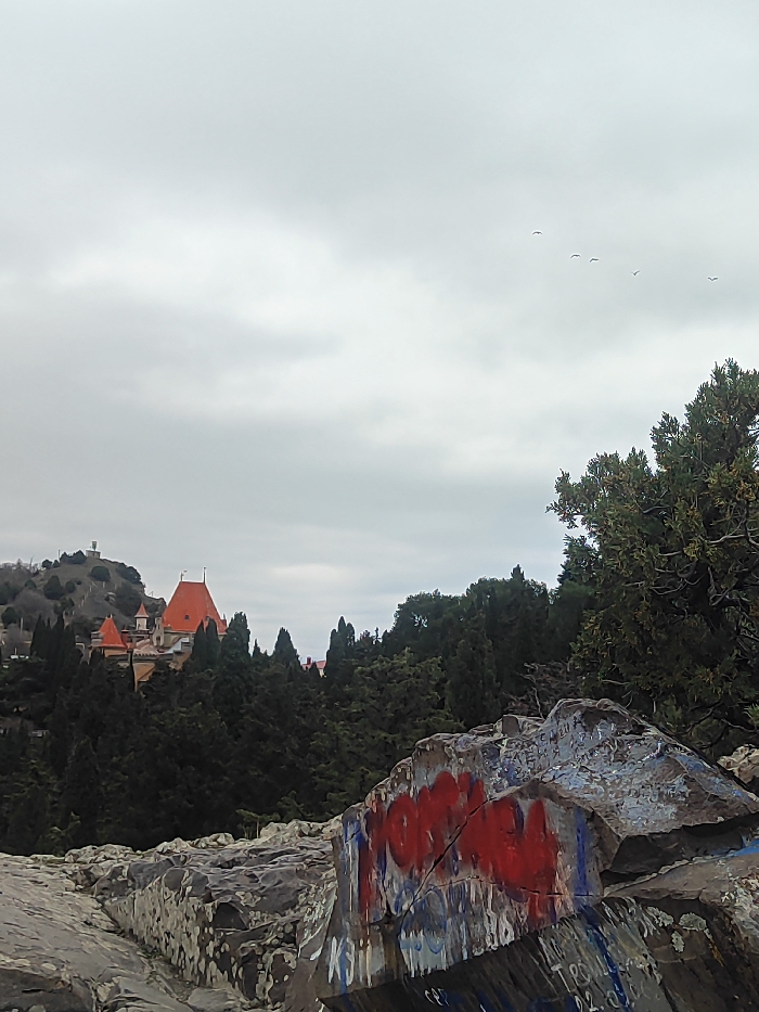 The image displays a landscape in Utios, Ukraine, under an overcast, light gray sky. The foreground is dominated by large, irregular gray rocks exhibiting weathering and lichen growth. A prominent rock on the right features extensive graffiti, primarily consisting of red spray paint applied over layers of blue and white markings, some of which are legible as Cyrillic characters and numbers. A dense band of dark green coniferous trees occupies the midground. Beyond the tree line, several buildings are visible on a hillside; the most prominent structure possesses a reddish-orange, multi-peaked tiled roof and multiple turrets. To the left, on a higher elevation, a small, cylindrical tower with a pointed top is discernible. In the upper right quadrant of the sky, a line of five small, dark bird silhouettes is observed flying horizontally. No human figures are present.