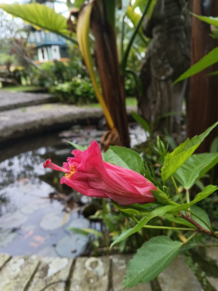 A vibrant pink hibiscus flower, partially unfurled, occupies the foreground, displaying a prominent red pistil with yellow anthers. The flower is attached to a stem with multiple green leaves. To its immediate left, a calm body of water, appearing to be a pond or decorative pool, features several floating circular lily pads. A rough-hewn stone border or pathway edge runs along the lower left of the water. In the midground, a large, dark brown plant stalk or tree trunk is visible behind the flower, and further back, a weathered grey stone statue of a humanoid figure is partially obscured by dense green foliage. The distant background reveals a light-colored building with a blue roof and white window frames, set amidst extensive green vegetation. The scene depicts a garden environment under ambient light conditions in Trairão, Brazil. No individuals are present.