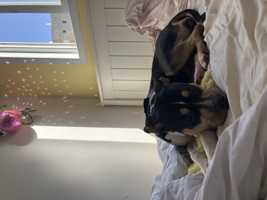 The image depicts an indoor scene within a bedroom, featuring a dog resting on a bed. A black, tan, and white dog, appearing to be a Pitbull-type breed, is lying on a light-colored bedspread, with its head resting on a small, yellow, textured object. The dog faces forward, exhibiting a relaxed posture. The bedroom features a white slatted headboard against a light yellow wall. To the left, a white wall is visible, receiving direct sunlight that casts a prominent vertical shadow. A small, pink, mirrored disco ball hangs from the upper section of the white wall, partially obscured by a green trailing plant. The disco ball reflects numerous pink light spots onto the yellow wall and the bed's surface. A white-framed window on the right side of the image reveals a clear blue sky and an exterior view. Visible through the window is a light-colored, multi-story concrete building with a flat roof, featuring two distinct small, square, dark-recessed windows on its visible facade. This architectural style, characterized by unadorned light concrete and functional window placement, is commonly observed in the Bauhaus and International Style buildings prevalent in the city of Tel-Aviv, Israel.