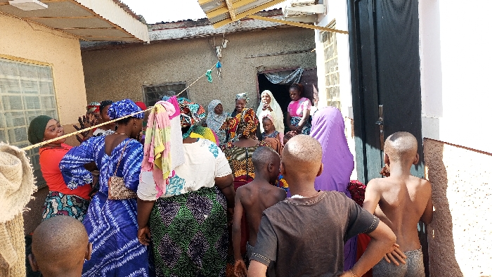 The image depicts an outdoor gathering of approximately 15-20 individuals, predominantly adult females and several young boys, within a residential compound in Afaka, Nigeria, under clear daylight conditions