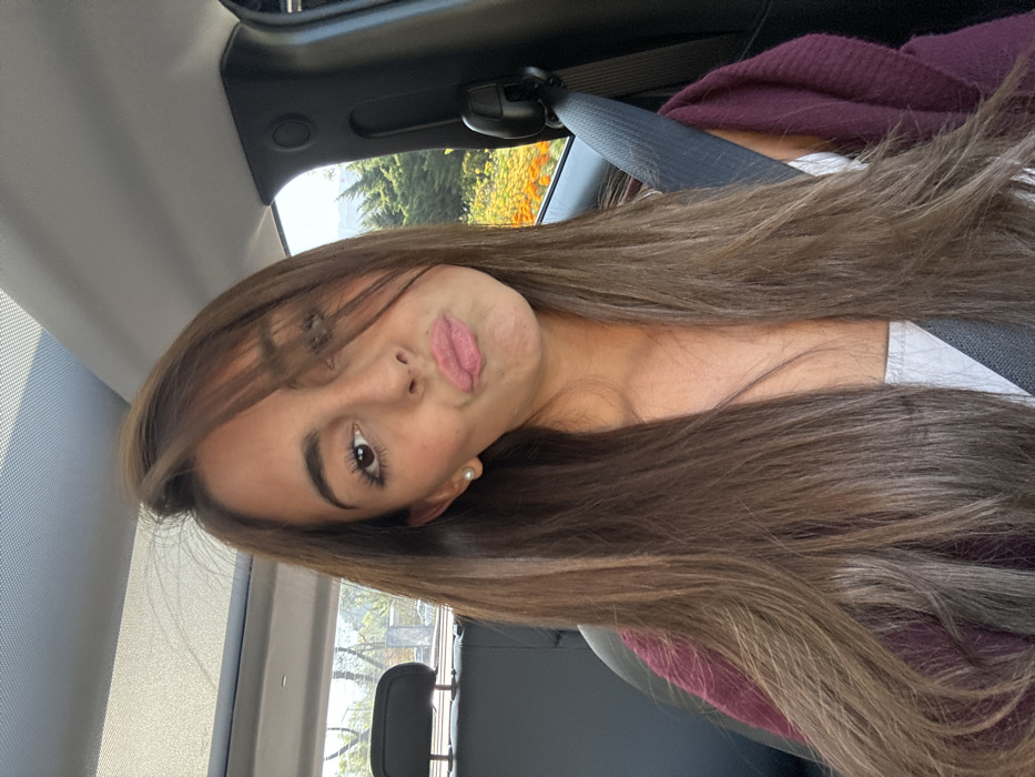 The scene is inside a passenger vehicle in Interlomas, Mexico, under natural daylight. A young adult female, with long, straight, medium-brown hair exhibiting lighter highlights, is positioned in the front passenger seat. She wears a white garment beneath a dark red cardigan and a pearl earring in her left ear. A black seatbelt is engaged diagonally across her torso. Her facial expression is a pouting pose directed at the camera, with her right eye partially obscured by strands of hair. The vehicle interior shows a dark headrest in the background and a sunroof overhead. Outside the vehicle, visible through the windows, are dense green trees and a section of vibrant orange/yellow flowering plants.