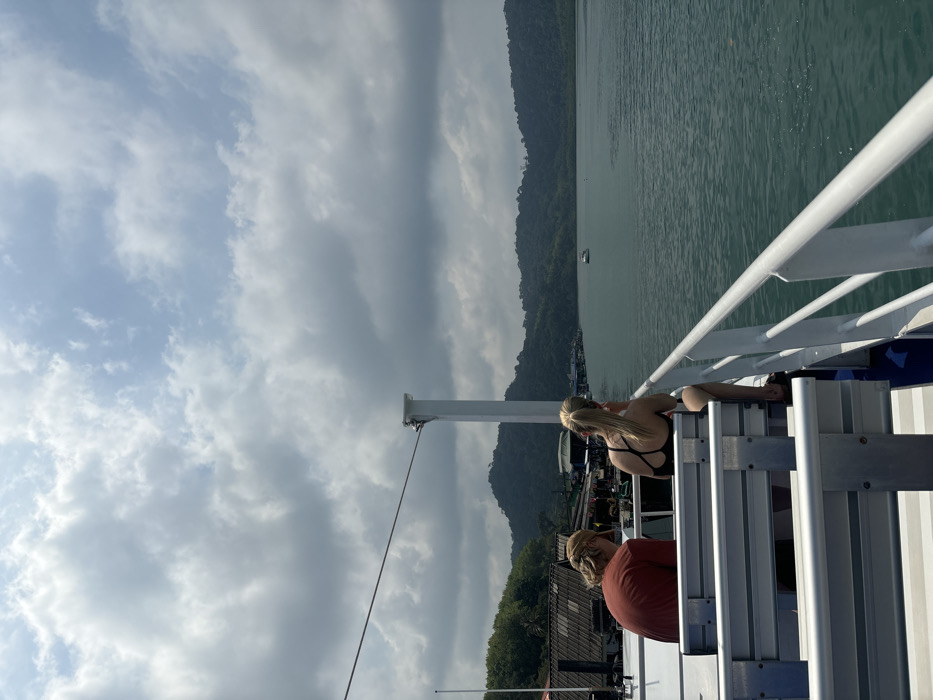 Two women are on a ferry overlooking a body of water. One woman, with blonde hair, wears a black swimsuit. The second woman has short blonde hair and wears a red shirt. They sit on metal benches next to white metal railings. In the background are green mountains, a cloudy sky, and calm water.