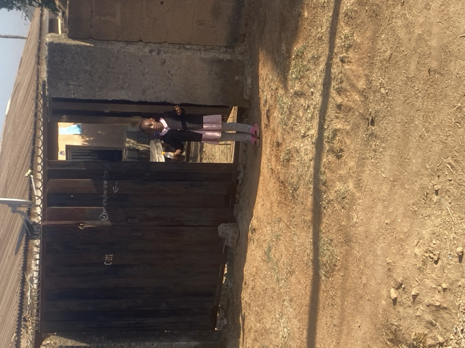 A young girl in a school uniform stands in a doorway, holding a water bottle. The doorway leads to a dark interior, possibly a dwelling. The door itself is made of dark metal and has some writing or markings on it. The ground surrounding the doorway is dry, dusty, and sparsely covered with vegetation. The structure appears to be made of concrete blocks and has a rusted metal roof. A satellite dish is visible on top of the structure.
