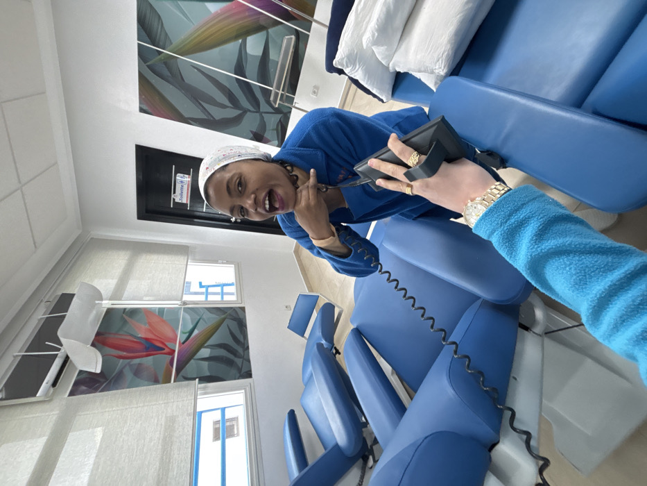 The scene depicts an interior view of a medical facility or clinic in Meknes, Morocco. The room features white walls, a white grid-paneled ceiling, and light-colored tiled flooring. On the left, two windows with horizontal blinds reveal an exterior white building with blue accents. An air conditioning unit with a deflector is mounted above these windows. Two large wall panels featuring stylized tropical foliage and red-orange flowers are on the left and right walls. A dark door with a white "Toilette" sign is visible on the rear wall, slightly right of center. In the foreground and mid-ground, several blue, padded medical recliners with armrests are present; a prominent one occupies the center, another is behind it, and a third is partially visible to the left. These chairs have coiled black cables extending from their bases. White folded pillows are stacked on the rightmost recliner. A person's right arm, wearing a textured blue long-sleeved top, a gold-toned wrist watch, and two gold-toned rings, extends from the immediate foreground, holding a black handheld device by a strap. This person is taking the photograph. Directly facing the camera in the mid-ground is a woman with dark skin and hair, wearing a patterned white head covering and a blue long-sleeved jacket over a lighter undershirt. She has a dark, beaded choker around her neck. Her mouth is open in an animated expression, and her right hand is raised near her chin, index finger extended, as she looks directly towards the camera.