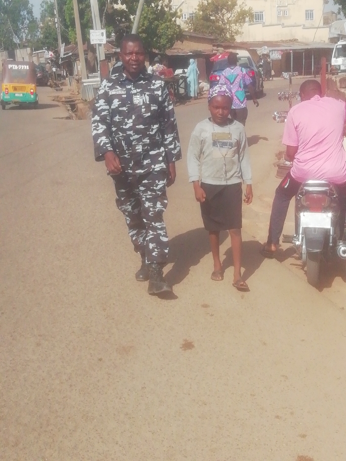 The image depicts a sunlit street scene in Jos, Nigeria. In the immediate foreground, a male individual in a dark and light camouflage uniform, bearing "NIGERIA POLICE" and "IBRAHIM H." patches, walks towards the viewer, wearing dark boots. To his right and slightly behind him, a young person, possibly female, wearing a light grey long-sleeved top with a graphic, a dark knee-length skirt, sandals, and a patterned head covering, walks in the same direction. A beaded necklace is visible on the young person. In the mid-ground right, a male in a pink shirt sits on a stationary dark motorcycle, facing away from the camera. The street surface is a light-colored, unpaved or worn asphalt. The background features a yellow and green Keke Napep (tricycle taxi) with license "PTA-9771" on the left. The street is lined with market stalls featuring corrugated metal roofs, various low-rise buildings of concrete construction, and scattered trees. Additional pedestrians are visible throughout the background, including one in a vibrant patterned shirt and another in a light blue garment.