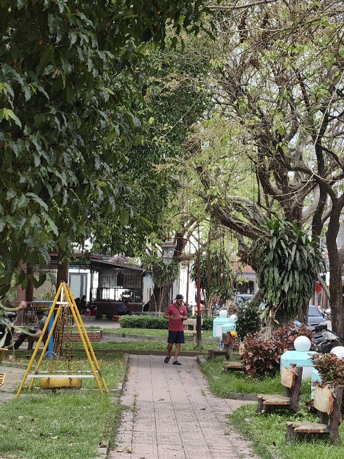 The image depicts a daytime scene within a public green space in Phú Xuân Ward, Vietnam. A light-colored paved pathway, constructed from rectangular pavers, extends from the foreground into the midground. Lush green grass borders both sides of the path. In the midground, a male individual, appearing light-skinned, walks from left to right on the pathway. He wears a red short-sleeved shirt, dark shorts, dark shoes, and a dark baseball cap. He is holding a small dark object, possibly a mobile phone, in his hands and appears to be looking down at it. To the left of the pathway in the foreground, a yellow A-frame swing set with chain supports and a black tire swing is present on the grass. Further left, obscured by foliage, a person in a dark shirt is partially visible seated on a bench or similar structure. In the midground to the right of the pathway, a series of low, rustic benches made from logs or tree stumps are arranged near light blue cube-shaped planters and beds of reddish-brown foliage. Behind these elements, mature trees with prominent roots and numerous aerial roots or vines are visible, some with lush green foliage and others with more sparse, bare branches. Large green epiphytic plants, possibly ferns, cling to some tree trunks. In the background, behind the trees and structures, several buildings with dark roofs and open facades, suggesting a cafe or food stall, are visible. Multiple individuals are seated at tables in this area. Further in the background, a street or parking area is discernible with partially visible vehicles, including cars and motorbikes. Street lamps with square lanterns are interspersed among the trees. The overall environment is heavily shaded by a dense tree canopy.