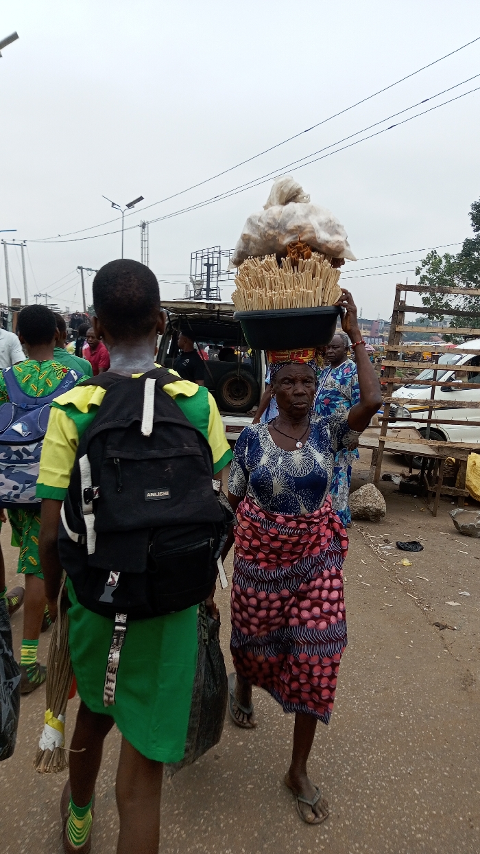 This image depicts a street scene in Onitsha, Nigeria, under an overcast sky. The foreground is dominated by two individuals walking away from the viewer. On the left, a person, seen from the back, wears a yellow and green short-sleeved top, green shorts, a black backpack with the word "ANLUSHI" visible, and green and yellow striped socks with shoes. A bundle of slender sticks or brooms is tied to their lower back. To the right, an older woman walks forward, her gaze directed towards the viewer. She is balancing a large black basin on her head, filled with numerous thin, light-colored sticks, possibly toothpicks or skewers. Above the sticks, a large, irregularly shaped object wrapped in white material rests within the basin. She wears a blue and white patterned short-sleeved top and a red and black patterned wrapper. Her left hand is raised, lightly touching the basin for stability. She wears simple dark-colored flip-flops. The ground is a rough, unpaved or dirt road with visible rocks and debris. In the mid-ground, a dark-colored vehicle resembling a van or pickup truck with an exposed spare tire on its rear is parked. Further back, more people are visible, some standing, some walking. The background features various urban elements: utility poles with power lines, streetlights, metal scaffolding or market stalls, and other parked or moving vehicles. A portion of a green tree is visible on the far right. The overall impression is that of a bustling market or commercial area.