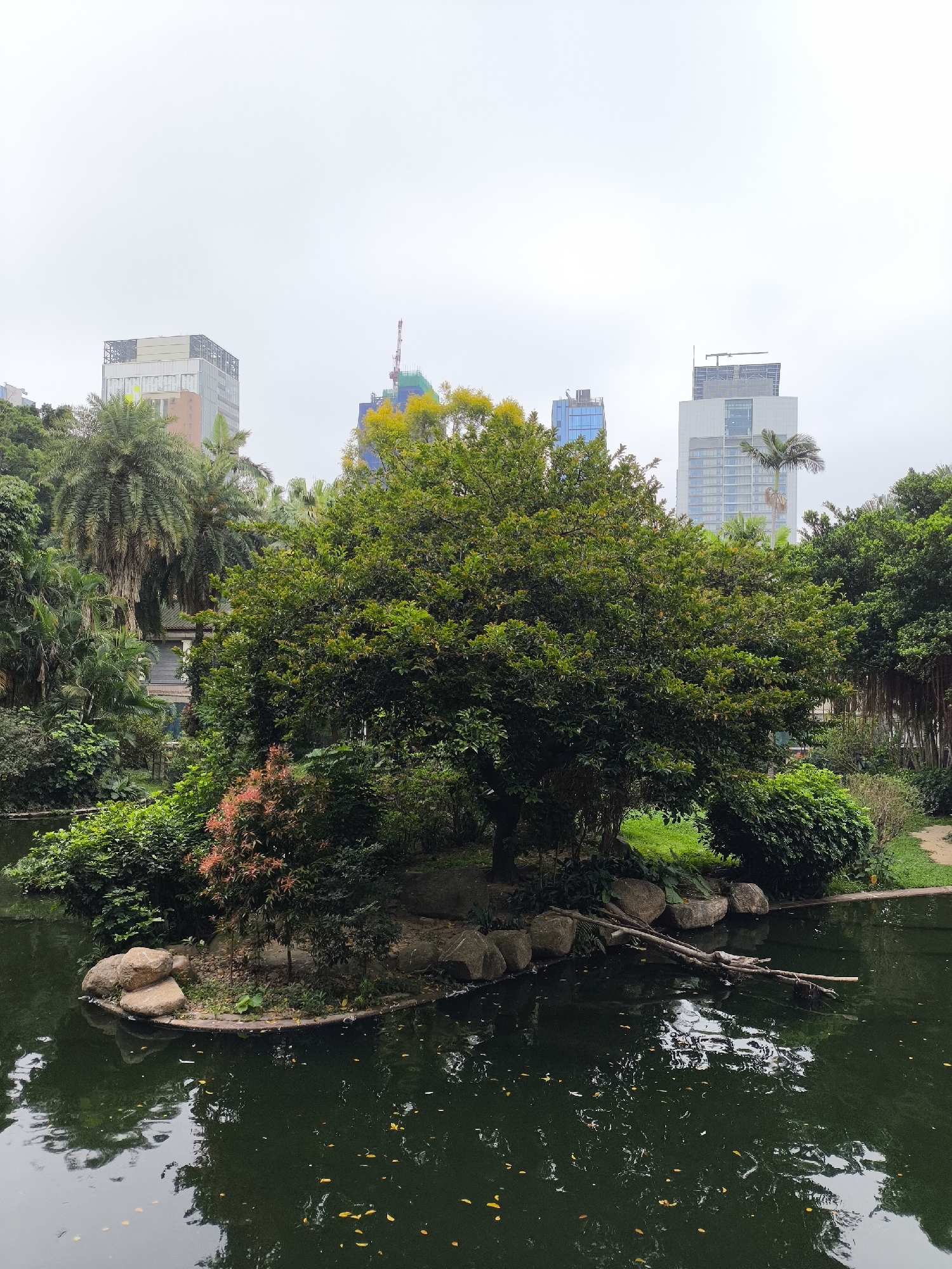 The image depicts a serene scene in a Hong Kong park, likely the Hong Kong Park itself. A small island, densely covered with lush green vegetation and trees, sits in the middle of a dark, still pond. The island is bordered by large rocks and a fallen tree trunk extending into the water. Surrounding the pond is more verdant greenery, including various trees and shrubs. In the background, several modern skyscrapers rise, indicating the park's location within an urban area. The sky is overcast, suggesting a cloudy day. There are no people visible in the image.