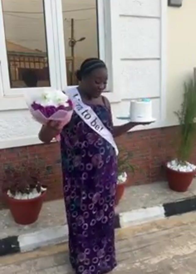 A young woman stands outside a house, dressed in a long purple dress, holding a bouquet of purple and white flowers in her left hand and a small white cake on a plate in her right hand. She is wearing a sash that reads "Mom to be!" and appears to be celebrating. The background includes a building with a brick base and stucco upper portion, a window, potted plants, and a section of painted curb. Music plays in the background. The woman's face shows a happy expression.