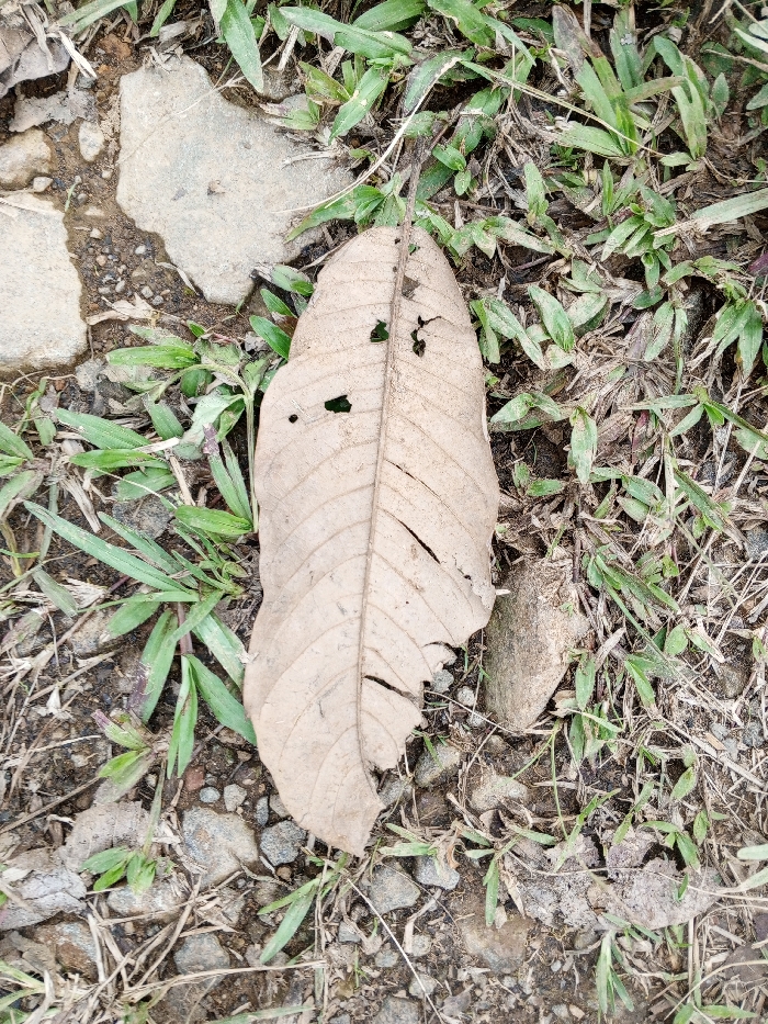 The scene depicts a close-up, overhead view of a natural ground surface in Thotagamuwa, Sri Lanka. A single, large, desiccated, light brown leaf is centrally positioned, displaying visible veins, several irregular perforations, and a frayed right edge. The leaf rests on a heterogeneous ground composed of dark brown soil, scattered grey and brown pebbles, and sparse patches of short green grass. Dried grass blades and plant debris are also present across the dirt and stone substrate. No individuals or specific activities are observed.