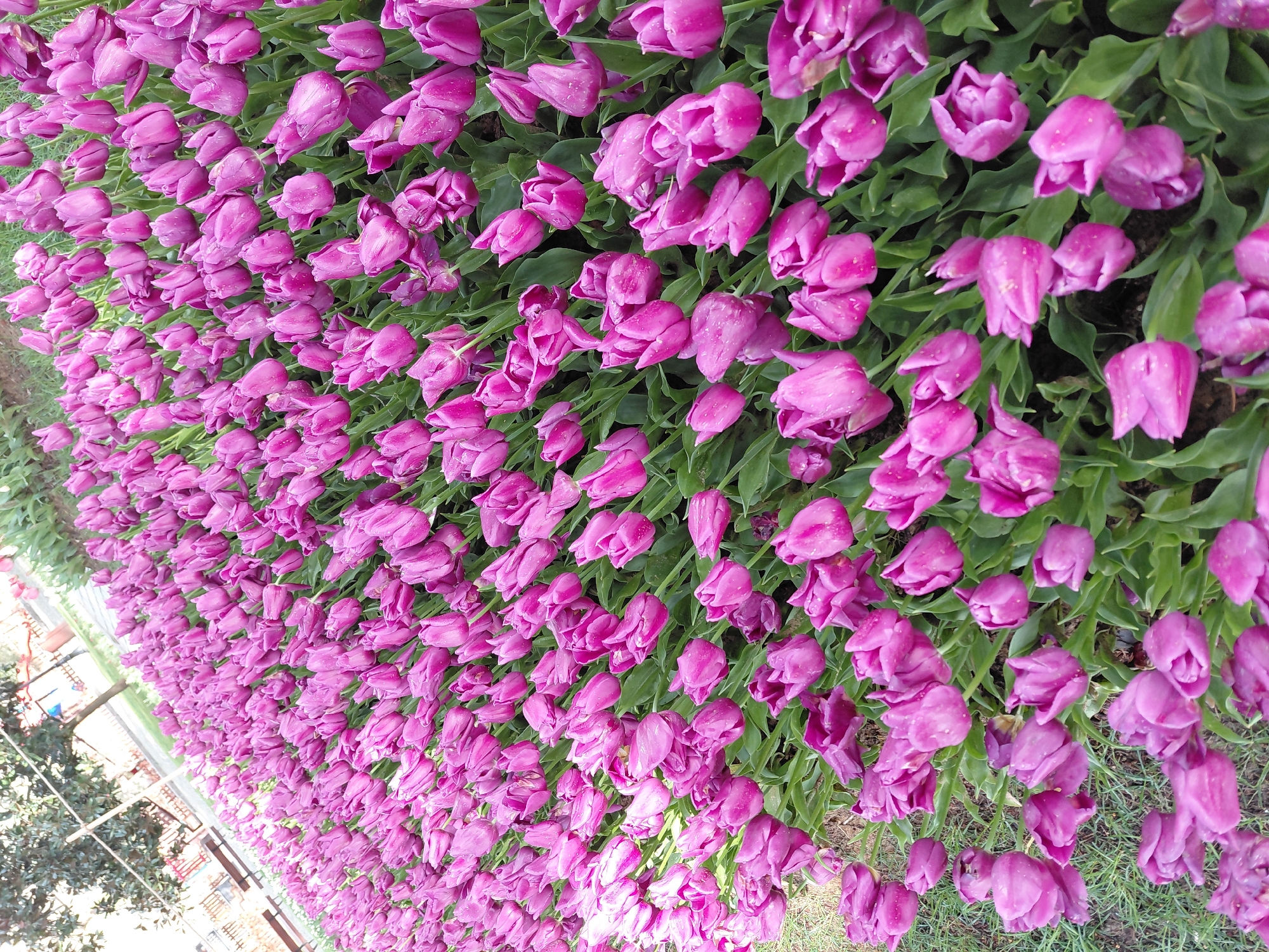 A dense expanse of purple tulips with visible water droplets covers a flowerbed, stretching into the distance