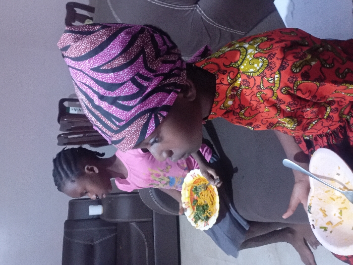 Two girls sit side-by-side eating. The girl on the left wears a pink shirt and has braided hair. The girl on the right wears a red patterned dress and a purple and black patterned headwrap. She holds a plate of noodles. Another, mostly empty bowl, sits beside her. The girls are seated on a brown sofa in front of a beige wall.