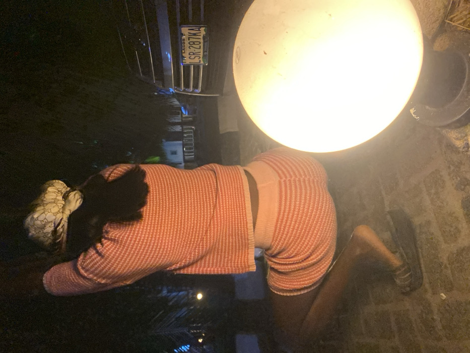 A woman with dark hair, a head covering, and a striped orange and white outfit is bent over near an illuminated outdoor light fixture. She is wearing sandals. A vehicle is parked nearby with a Lagos license plate reading "LSR-287 KA". The area appears to be a paved outdoor space at night, possibly a residential or commercial property. The overall scene is dimly lit with the primary light source being the outdoor fixture.