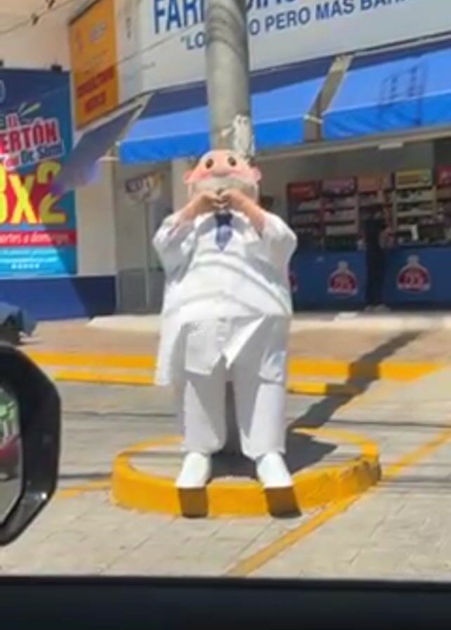 person dressed as Dr. Simi, the mascot for Farmacias Similares, standing in front of one of the pharmacy locations. The mascot is wearing a white lab coat and has a large head with a smiling face. The pharmacy is visible in the background, with its blue and white signage and awnings. A car is parked nearby, and a street lamp is positioned between the mascot and the camera. There is a 3x2 promotional sign visible on the left. A person is walking inside the pharmacy.