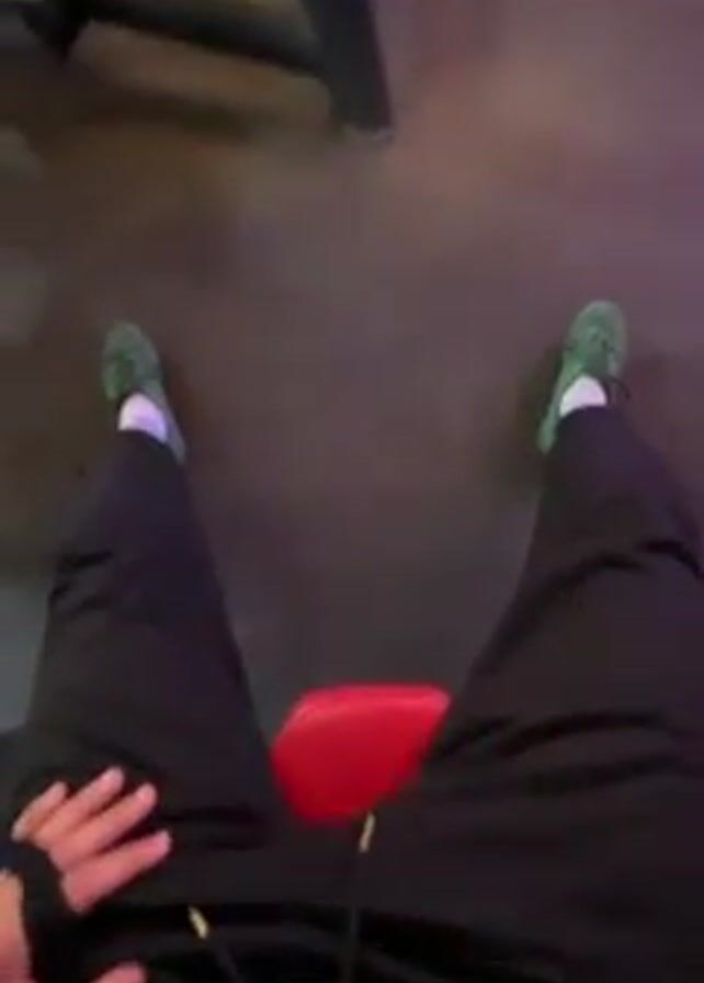 A person is sitting on a red seat at a gym. The person is wearing black sweatpants, a green sweatshirt, and green shoes. The camera pans up and shows the person seated on a leg extension machine. The camera pans around the gym which is lit with pink and purple lights and contains various weight machines. The machines are predominantly grey and black. Other people can be seen in the background.