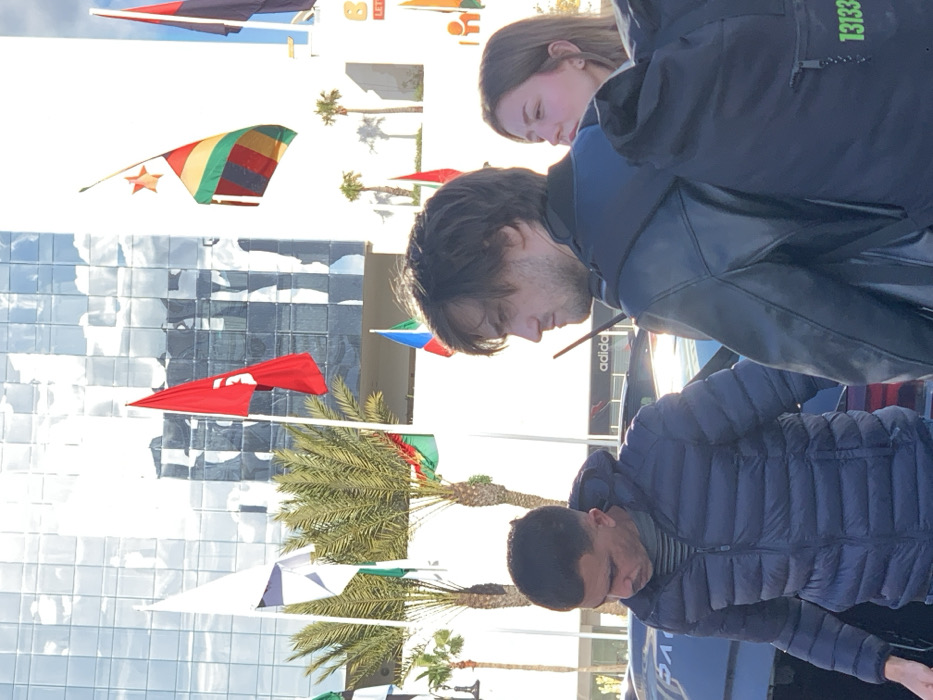 The image depicts three individuals in a bright, sunny outdoor urban environment in Tangier, Morocco, characterized by modern architecture and international flags