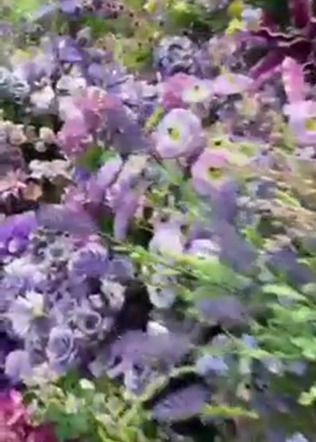 The camera pans across a display of artificial flowers. The majority of the flowers are shades of purple, from lavender to deep violet. There are also some white and pink flowers interspersed. The display is dense and creates the impression of a flower wall. The background is out of focus, but it appears to be a store or event space. There is background music playing.