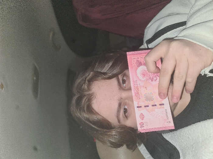 A young individual is depicted inside what appears to be a vehicle, presumed to be in Barza Municipality, Syria. The person, with medium-length brown hair, is looking directly at the camera. Their face is partially obscured by a stack of pink 10 Syrian Pound banknotes, which they are holding in their right hand. They are wearing a dark garment underneath a light-colored, possibly white, textured jacket with a dark stripe on the right shoulder. The vehicle's ceiling, a light-colored headliner, is visible in the upper portion of the image, showing minor wear and an overhead light fixture. A reddish-maroon fabric is visible on the right side of the frame, possibly part of the vehicle's interior or another object. The lighting in the scene is dim.