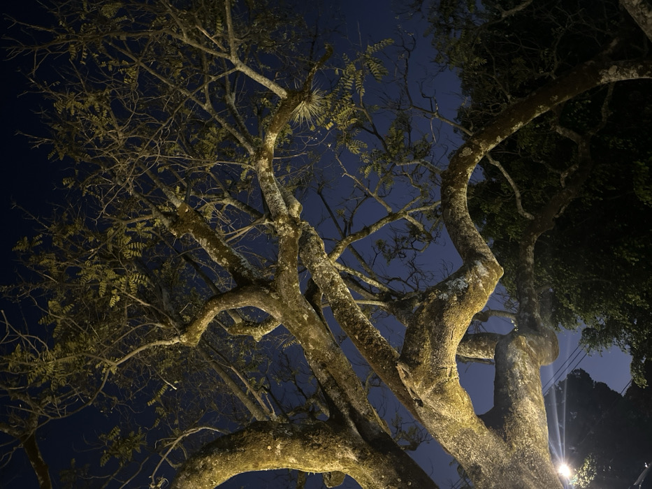 An upward-facing shot reveals a mature tree against a dark blue, almost black sky. The tree's trunk and branches are illuminated by a soft yellow light, highlighting their textured bark. Sparse foliage is visible, some branches appearing bare. The right side of the tree is partially obscured by darker green leaves, creating a contrast between the lit tree and the deep sky.