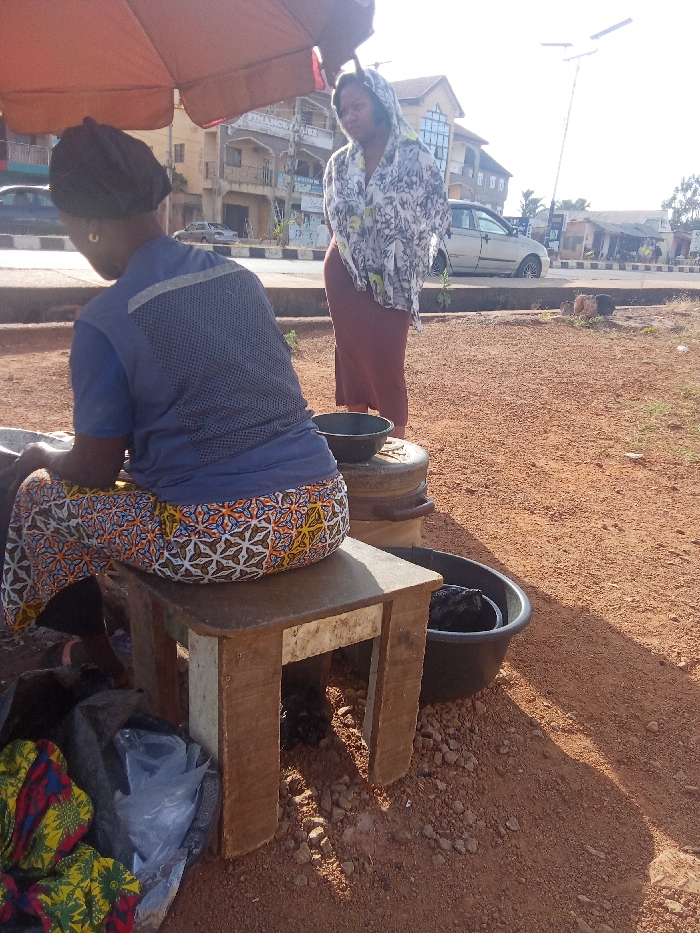 Two women are outdoors under a shade. One sits on a small wooden stool, wearing a patterned skirt and blue shirt. Next to her is a black bucket and a bag. The other woman stands wearing a floral top and a brown skirt. In the background, a road with cars and buildings can be seen. The ground is reddish-brown.