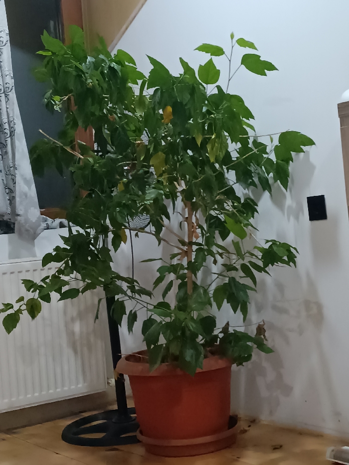The image displays an indoor scene within a room in Tbilisi, Georgia. The central focus is a large, vibrant green potted plant, featuring numerous broad leaves, some exhibiting a slight yellowish tint, and slender light brown stems. The plant is housed in a terra cotta-colored plastic pot with a corresponding saucer, resting on a light-colored wooden floor. To the immediate left of the plant, a white radiator is positioned beneath a window, partially obscured by a white curtain adorned with a dark, intricate pattern. A black, circular stand, possibly for a fan, is partially visible behind the plant on its left side. The background consists of a plain off-white wall, where a small, black square object (likely an electrical fixture) is mounted to the right of the plant. A subtle shadow of the plant is cast upon this wall. No individuals or animals are present within the depicted scene.