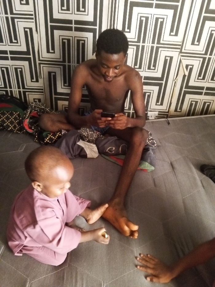An unidentified indoor location, likely a bedroom or living space, is depicted with a grey, quilted mattress serving as the primary surface. The background wall features a black and white geometric pattern. Three individuals are present. A young male, appearing to be a teenager or young adult, is seated cross-legged on the mattress, bare-chested and wearing patterned shorts. He has short, dark hair and dark skin. He is holding a black smartphone with both hands, looking down at the screen. To his left, on the mattress, is a pile of folded clothing items and a patterned bag. In front of the male, a small child with dark skin is seated on the mattress. The child wears a light purple, long-sleeved garment and has a noticeably prominent forehead. The child is holding a small, shiny, gold-colored object in its right hand and is looking downwards. Its left hand is positioned near the bare right foot of the seated male. Only the bare right hand and a portion of the forearm of a third individual are visible on the mattress in the lower right section of the frame. A black cable runs along the mattress near the wall on the right side, and a dark-colored slipper or shoe is partially visible further to the right on the mattress.