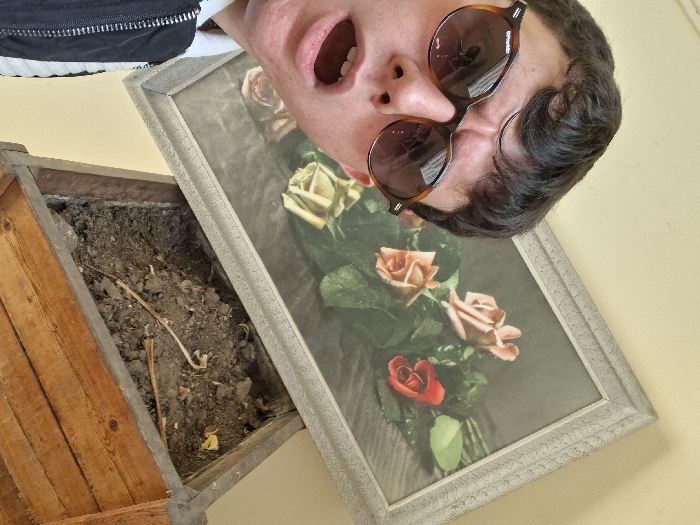 An indoor scene in Plovdiv, Bulgaria, is captured at a tilted angle. In the upper left foreground, a young individual, likely male, is depicted in a close-up, selfie-style photograph. He has dark, wavy hair and wears dark-rimmed sunglasses with "P.Pravila" visible on the lens. A dark zippered garment is worn over a white collar. His mouth is open, and his forehead is creased, indicating an expression of surprise or exclamation. Behind the individual, a framed picture depicting a still life of peach, red, and yellow roses with green leaves hangs on a plain, light-colored wall. Directly beneath the picture, an open wooden compartment or drawer, constructed from light brown wood with horizontal grain, is visible. This compartment is filled with dark, loose soil containing sparse plant debris.