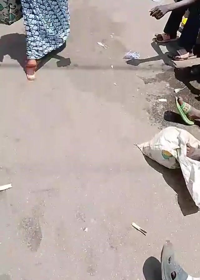 group of people on an asphalt road. There are four children sitting or lying on the road, and an adult woman walks past them. The road has stains and bits of debris on it. The camera perspective is from someone walking on the road, showing their feet in sandals.