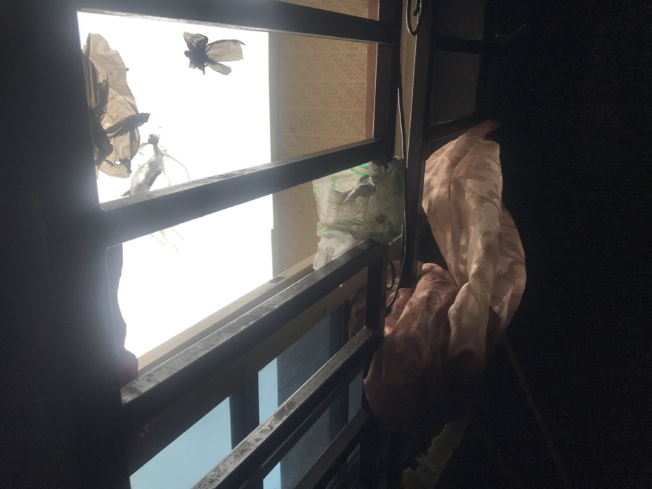 This forensic description details a static scene in Lokoja, Nigeria, depicting an upward-angled view from an interior space through a barred opening. The top section of the image shows a dark overhead area containing a large mass of light brown, crumpled fabric. Immediately below, a dark metal grating, consisting of diagonally angled rectangular bars, partially obstructs the view. A white item with green patterns, consistent with a disposable diaper, is wedged within the upper part of this grating. Several discarded, crumpled plastic bags, predominantly light brown or transparent, are caught on the lower sections of the metal bars, positioned outside the interior space. The exterior environment is characterized by intense backlighting, rendering the sky a bright, overexposed white, with a small segment of blue visible through the upper right portion of the grating. No human subjects, actions, or interactions are present in the frame.