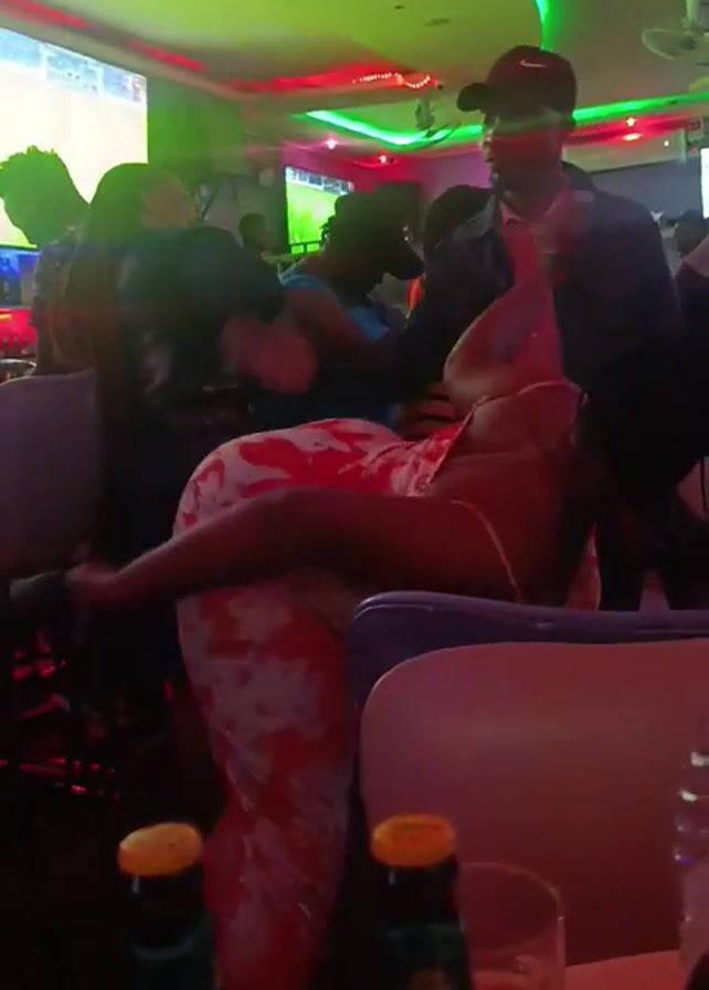 crowded bar or club setting, with several people socializing and dancing. In the foreground, two bottles of beer and a glass are visible on a table. A woman in a red and white dress is dancing vigorously, bending over at one point. She has long, dark hair. A man in a cap and jacket stands nearby, observing. Other people can be seen in the background, moving and talking. The lighting is colorful, with green, blue, and red hues, and the music is loud. The overall atmosphere seems lively and energetic.