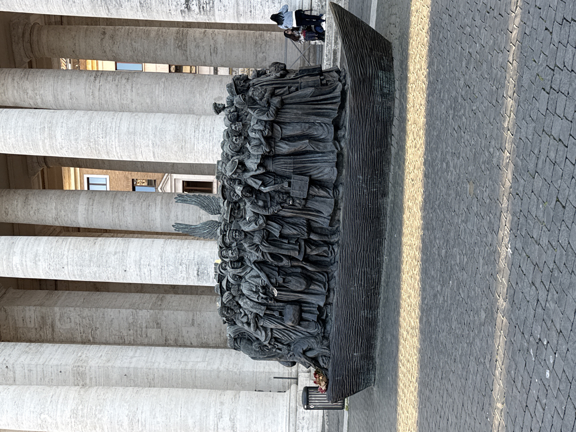 The bronze sculpture "Angels Unawares" by Timothy P. Schmalz is depicted on the cobblestone pavement of St. Peter's Square, Città del Vaticano, Vatican City. The central subject is a densely packed group of approximately 140 diverse figures, including adults and children, standing within a large, flat-bottomed boat. Many figures carry luggage, and a winged figure is visible rising from the center-rear of the boat's crowd. In the background, tall, fluted, light-colored stone columns of the St. Peter's Square colonnade dominate, with a multi-story building visible through them. A black cylindrical waste bin and a small floral arrangement are present at the sculpture's left bow. To the right, an adult and a child are seated on stone steps. The dark grey cobblestone ground is partially illuminated by natural light from the right, casting a shadow line across the foreground.