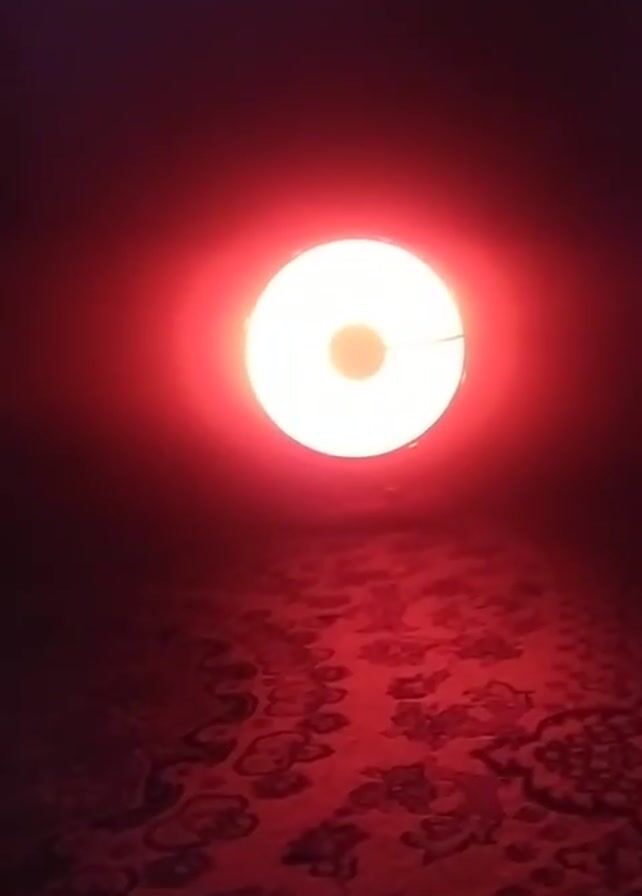 A dimly lit room is illuminated by a round, white light source. The light is centrally positioned, radiating a soft glow that casts a red hue across the room. A red carpet with a repeating floral pattern covers the floor, with the light reflecting off of it. The room otherwise appears dark and featureless. A human voice is audible in the background.