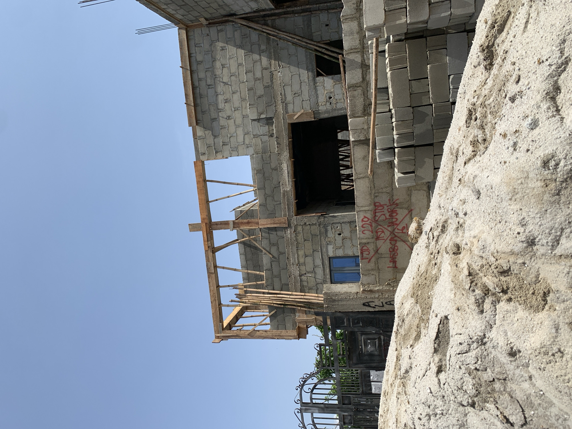 The image depicts a construction site of a two-story building in Ikorodu, Nigeria