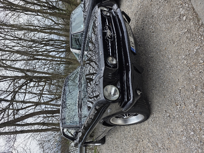 The scene depicts two classic automobiles parked on a light-colored gravel surface. In the foreground, a black first-generation Ford Mustang coupe is positioned slightly left of center, facing forward. Its glossy finish reflects the surrounding environment, including bare deciduous trees. Key details on the Mustang include chrome bumpers, grille, headlight bezels, and aftermarket five-spoke wheels with polished rims on the front left. Two small fog lights are mounted below the front bumper. A Slovenian license plate, "KR 1965G," is affixed to the front bumper, indicating the vehicle is registered in the Kranj administrative unit in Slovenia. Behind and to the right of the Mustang, a second dark-colored classic car is partially visible, showing its windshield, a portion of its hood, and a soft-top or targa roof. The background consists of a dense cluster of bare deciduous trees, suggesting late autumn or winter. The sky is overcast. No individuals are present in the image.
