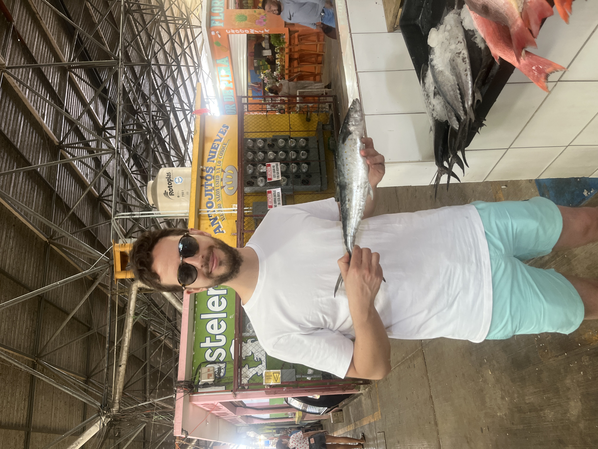 A man wearing sunglasses, a white t-shirt, and light blue shorts stands in what appears to be a bustling indoor market. He holds a fish in his hand, displaying it for the picture. Behind him is a stall selling fresh fish, including red snappers and other types covered in ice. Various market stalls with colorful signage are visible in the background, as well as the metal ceiling structure of the building. "ANTOJITOS NIEVES" is visible along with the Rotoplas water tank, suggesting the location is indeed inside a market of Puerto Escondido, Mexico.