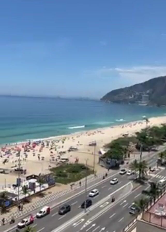n elevated view of Ipanema Beach in Rio de Janeiro, Brazil, on a sunny day. The beach is crowded with people. The water is turquoise and the sky is clear blue. There is a busy road running parallel to the beach with cars and buses. In the distance, mountains and small islands can be seen. The camera pans to the right, showing more of the beach and the ocean. Palm trees line the walkway next to the beach.