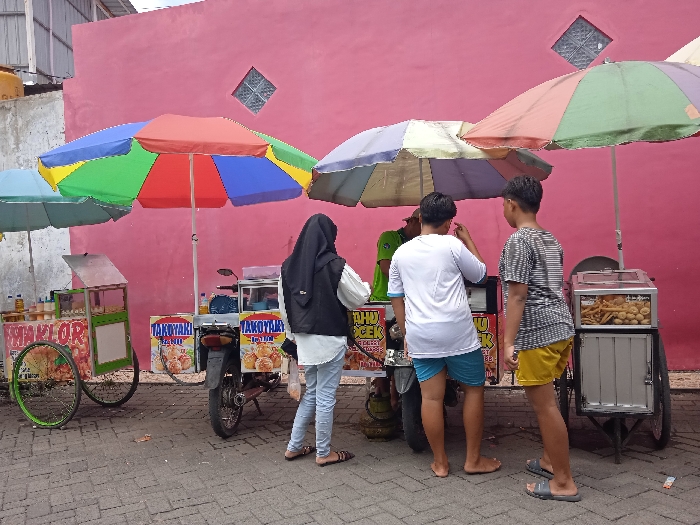 A street food vendor stands behind a motorized cart under a large umbrella. Two boys face the cart, seemingly making a purchase. A woman in a hijab stands to the left of the cart. The cart displays signs advertising "Takoyaki" and "Tahu Gejrot." Other food carts are visible in the background, each with a colorful umbrella. The scene takes place on a brick-paved street, with a bright pink wall in the background.