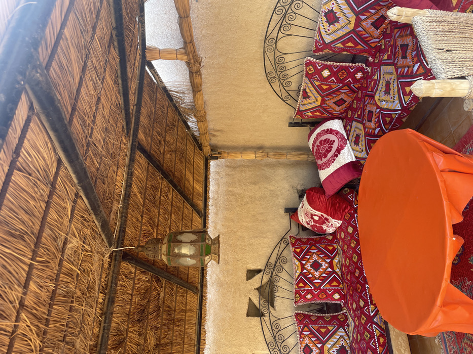 A view from beneath a thatched roof with black beams. A decorative lantern hangs from the roof. The scene transitions to a beige wall with a decorative metal shelf displaying patterned pillows in red, white, and gold. An orange table is visible in the foreground. The image suggests an indoor space with a rustic, possibly Middle Eastern or African-inspired design.
